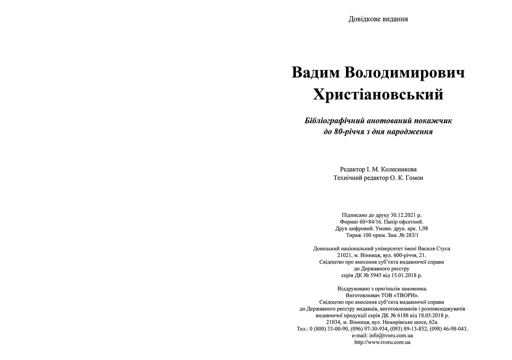 Покажчик з нагоди 80-річчя з дня народження професора В. В. Христіа-новського вміщує нарис про життя та науково-педагогічну діяльність вче-ного, наукові праці за 1974–2021 роки.